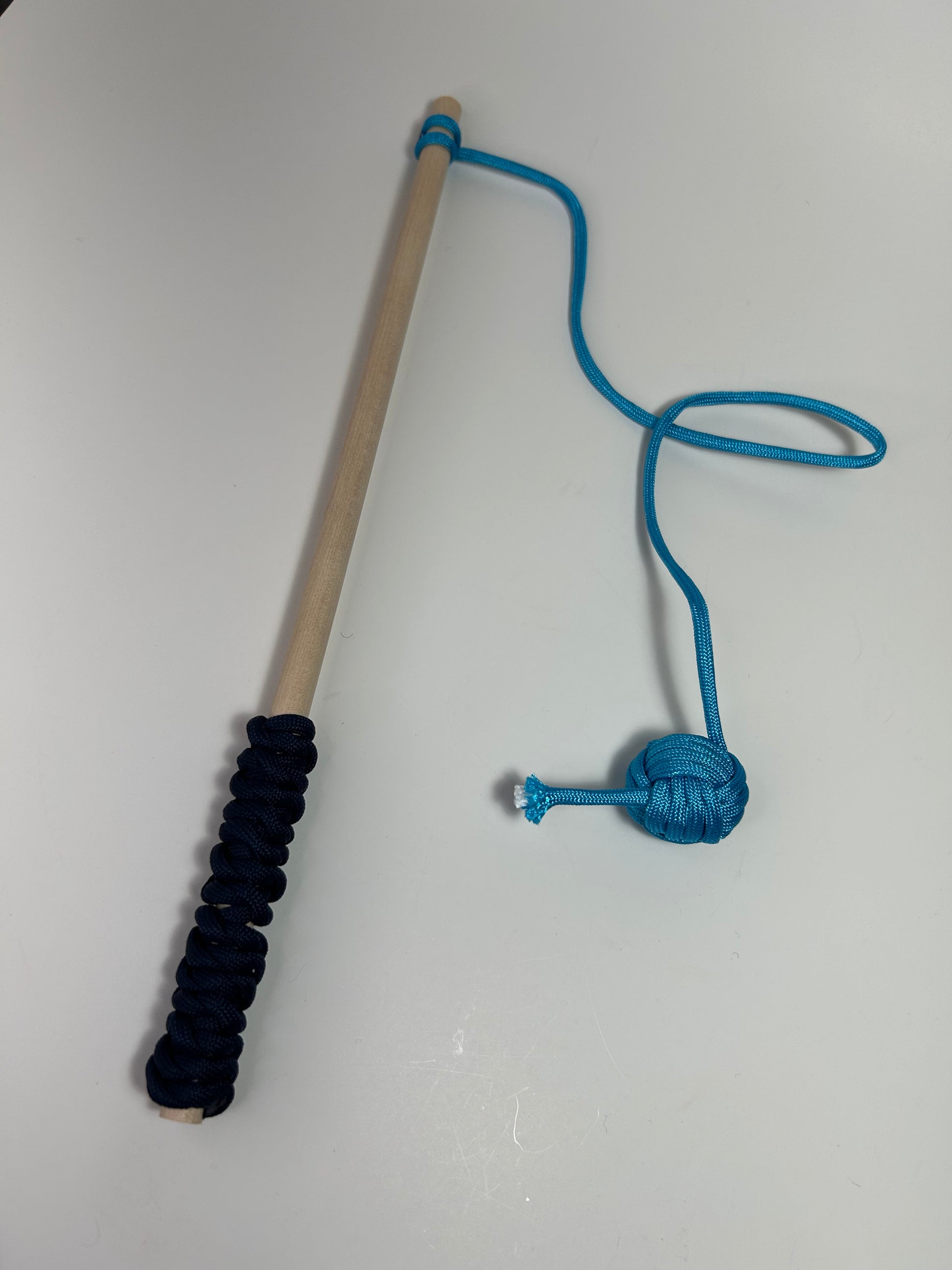 Jouet pour chats fait à la main avec de la paracorde bleu, une clochette et de l’herbe à chats!